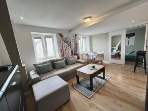 Odkryj Toruń z perspektywy stylowego poddasza! Jęczmienna Attic to wyjątkowe mieszkanie położone na 4. piętrze autentycznej toruńskiej kamienicy (bez windy). To idealne miejsce dla rodzin, grup przyjaciół czy osób szukających przestrzeni z charakterem. Apartament został zaprojektowany tak, aby komfortowo ugościć do 5 osób. Do dyspozycji gości są: sypialnia z podwójnym łóżkiem, sypialnia z pojedynczym łóżkiem oraz salon z rozkładaną sofa. Dodatkowo jest aneks kuchenny, w którym znajdą Państwo: ekspres do kawy, zmywarkę, lodówkę, mikrofalę, czajnik oraz wszelkie niezbędne przyrządy do gotowania.